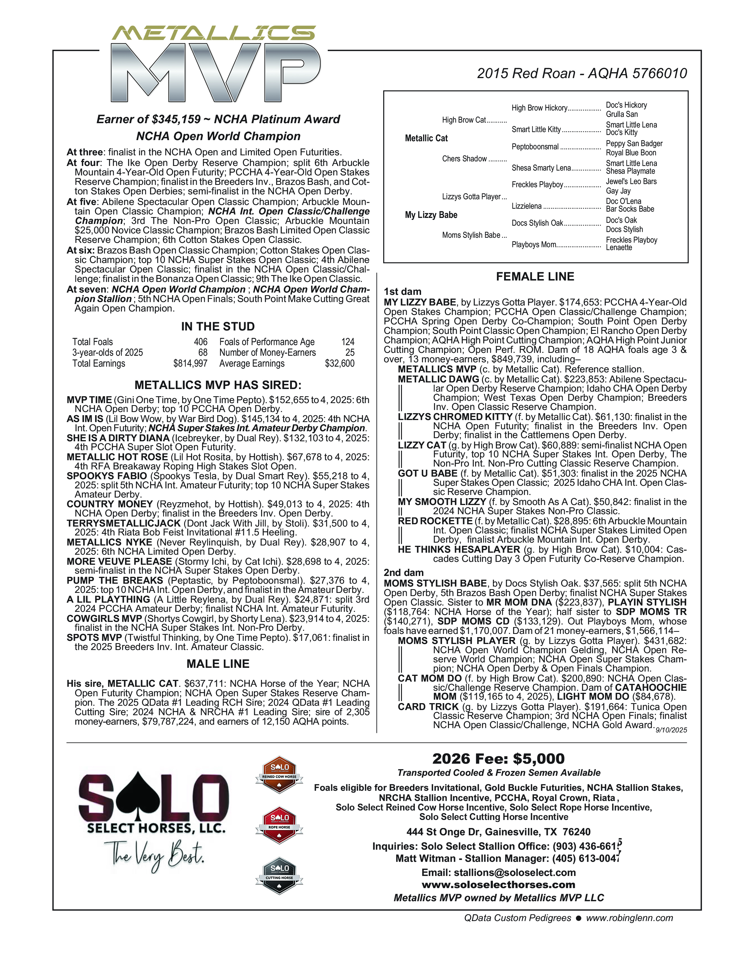 "Metallics MVP is more than just a champion; he's a horse that has captured the hearts of everyone who has seen him compete," Tim Smith said. "He's earned the nickname 'the People's Horse' for a reason. His consistency, intelligence and cow sense are unmatched, and his offspring are already showing the same promise."