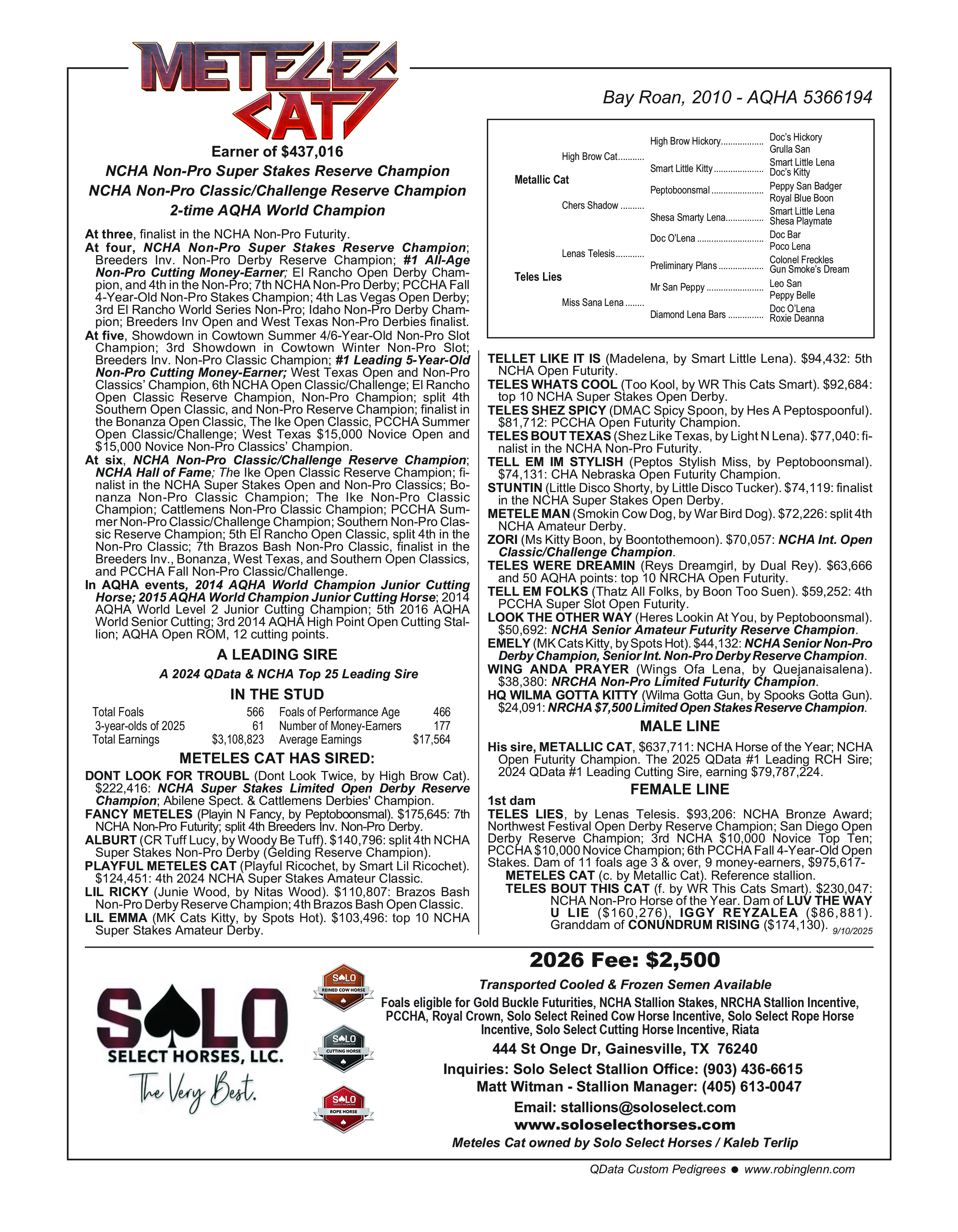Meteles Cat is a NCHA Hall of Fame stallion with significant earnings of $437,016, marking him as one of the cutting horse industry's most distinguished horses. Throughout his illustrious career, Meteles Cat made 48 Finals appearances, captured 14 Championships, and secured 8 Reserve Championships, solidifying his reputation as a top performer. His achievements also include 2 AQHA World Championships in the cutting.