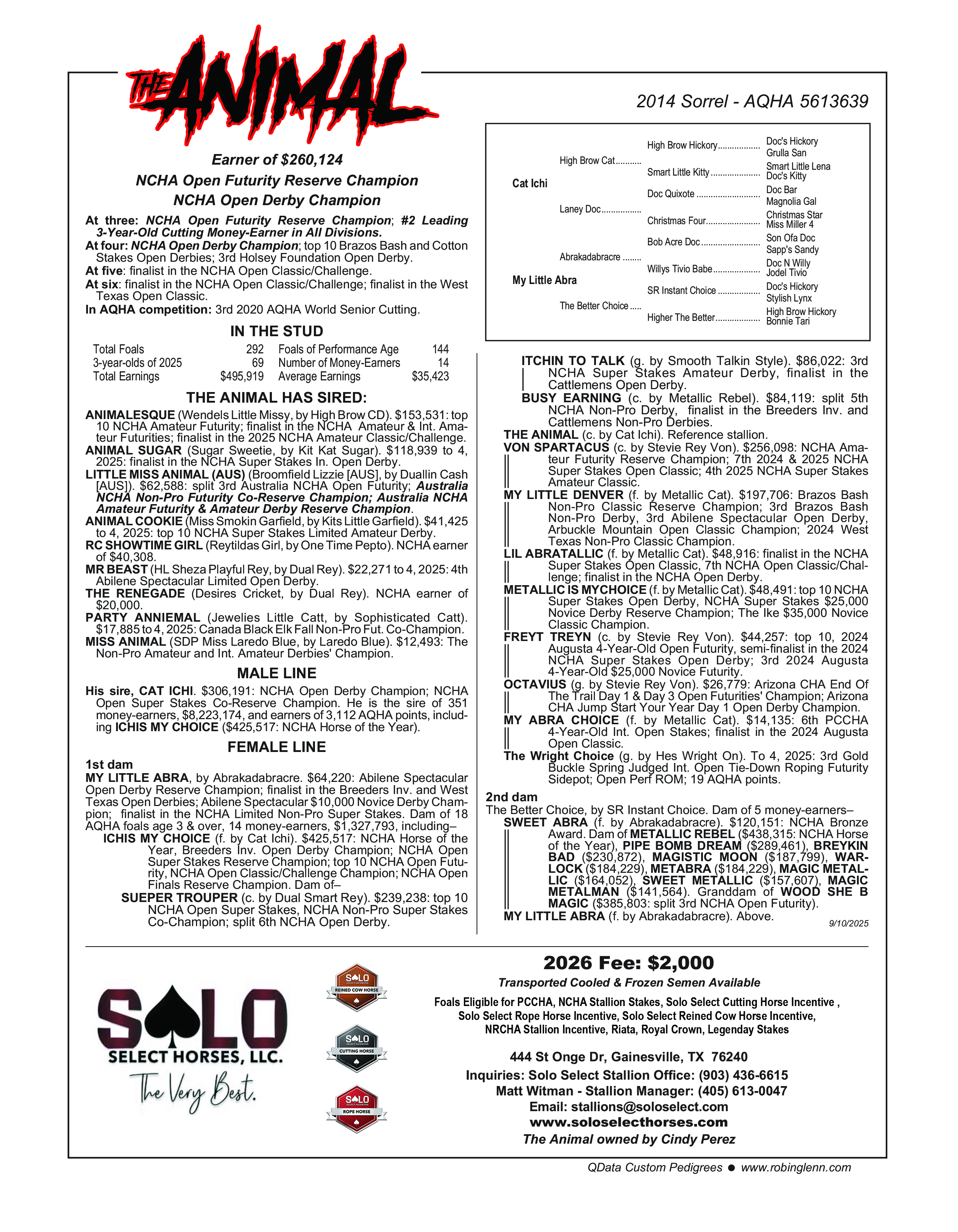 Bred from generations of champions, The Animal is sired by Cat Ichi, a $7.5 million sire and a NCHA Open Derby Champion. His dam, My Little Abra, has produced offspring with earnings exceeding $830,000, further solidifying The Animal’s place as a top-tier performer and sire. Standing at 15 hands with a powerful build and superior conformation, The Animal is poised to leave a lasting impact on the cutting horse industry, both through his own achievements and through the exceptional offspring he is sure to produce.