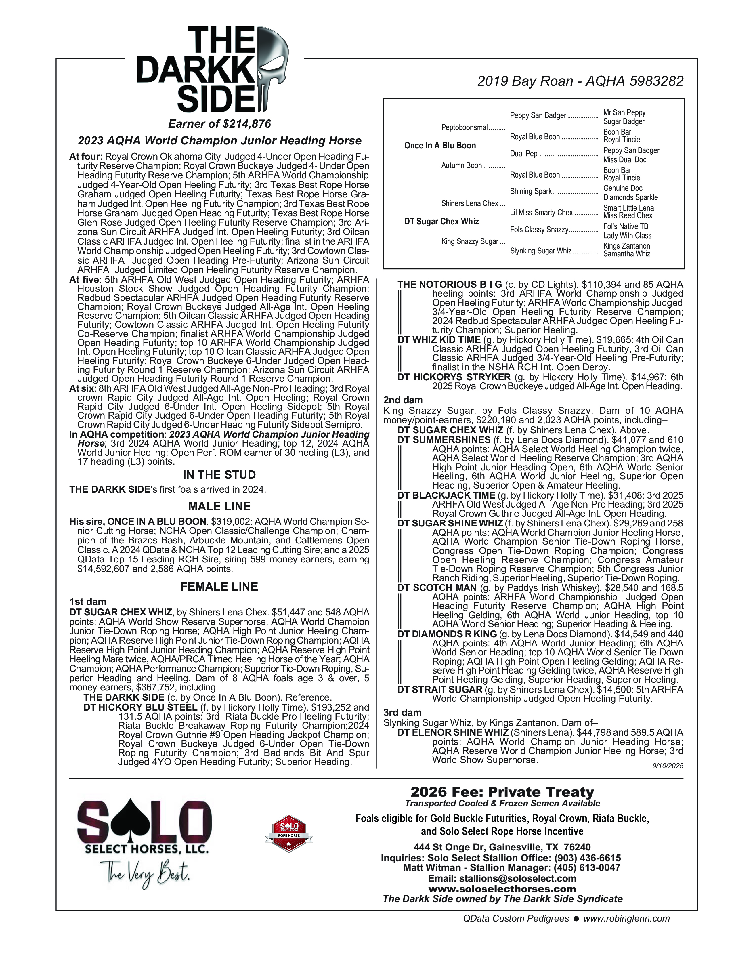 On the dam's side, The Darkk Side is out of DT Sugar Chex Whiz, a mare with an equally remarkable career. She was crowned the 2019 PRCA Heel Horse of the Year and has earned over $200,000. DT Sugar Chex Whiz is also the dam of multiple exceptional rope horses, including The Notorious B I G and DF Hollysfullofsugar, solidifying her reputation as a top producer in the industry.