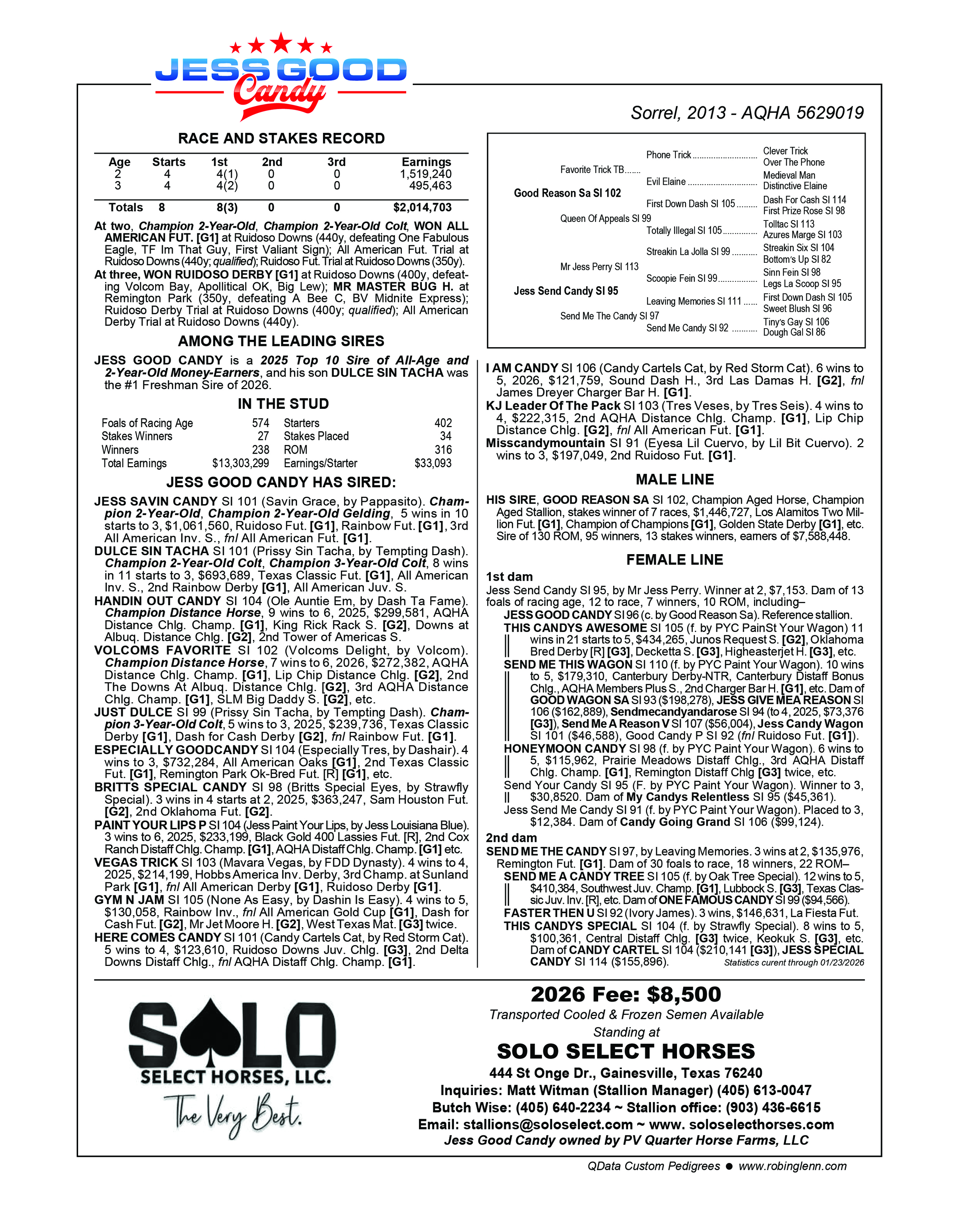 “Jess Good Candy has exceeded every expectation, both on the racetrack and now as a sire,” said Matt Witman, stallion manager at Solo Select Horses. “His foals are fast, consistent and winning at the highest levels. Relocating him to Solo Select puts him in a program that will maximize his impact and give breeders every opportunity to benefit from his genetics. We’re excited to see his influence continue to grow.”