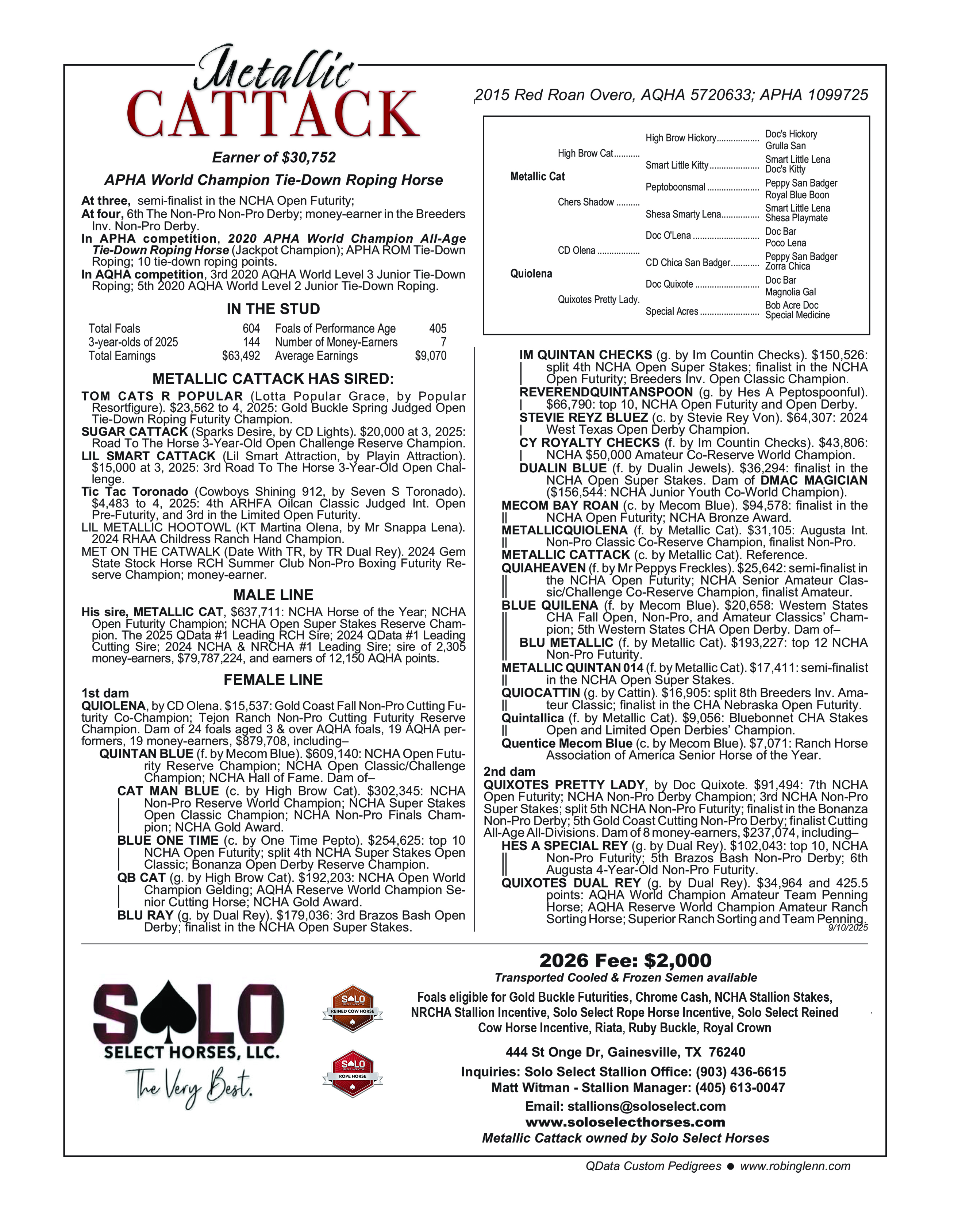 Sired by the legendary Metallic Cat and out of NCHA Hall of Fame producing mare Quiolena by CD Olena, Metallic Cattack combines cutting-edge genetics with a proven performance record, including over $30,000 in earnings and a 2020 APHA World Championship in Tie-Down Roping.